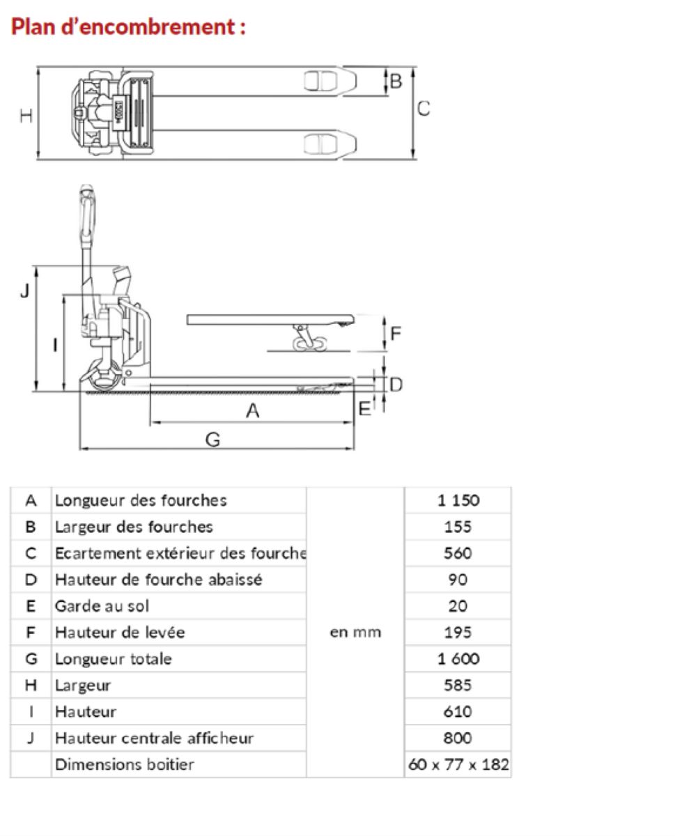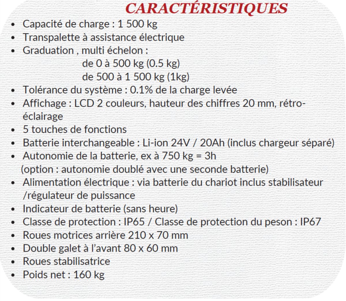 Description | - Le transpalette électrique peseur 1500 kg permet de soulever, déplacer et peser vos charges en une seule opération.